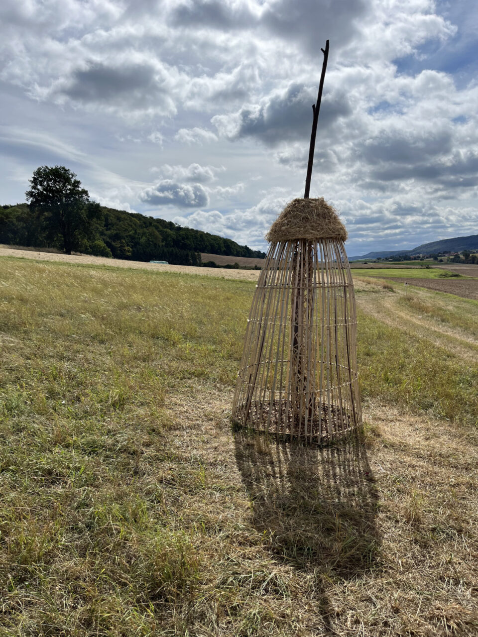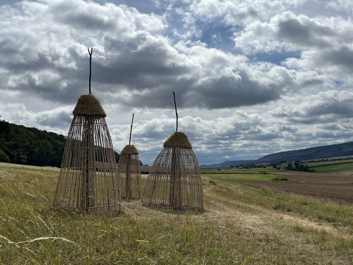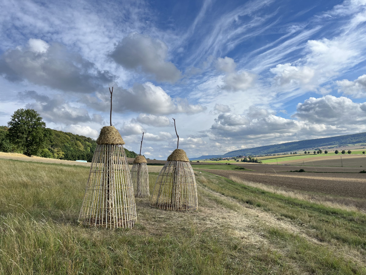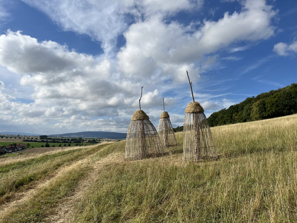 Three transparent figures rise from the ground, like a mirage. Their shape loosely refers to the old fashioned haystacks, but now you can see straight through. In their middle is a woven tube that goes into or comes out of the ground. A big branch protrudes from the top, like an antenna. It is the connection between above and below, out of the ground and into the ground. As haystacks have vanished by now from the European landscape, the sculptures are a poetic reminder of the small scale agriculture and the way we used to be connected to the earth for so long.