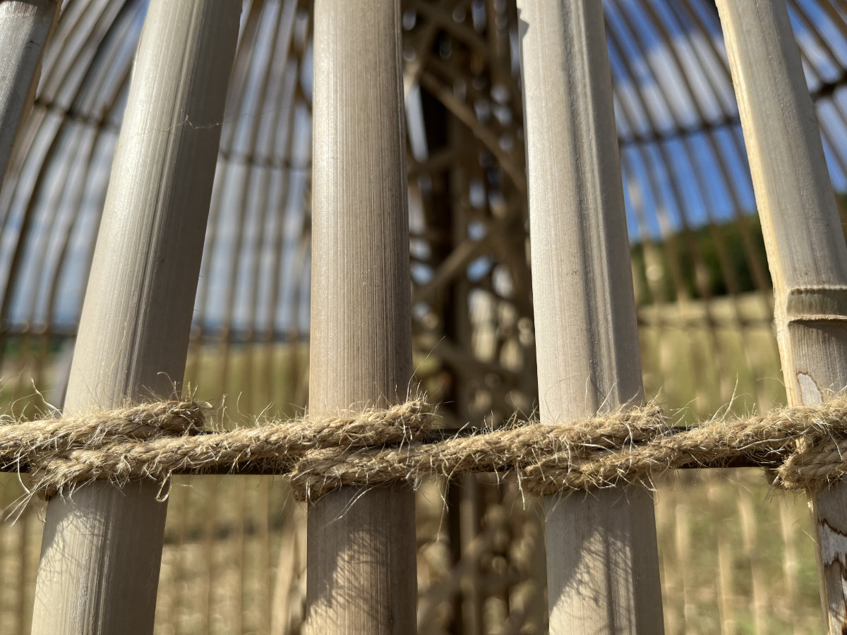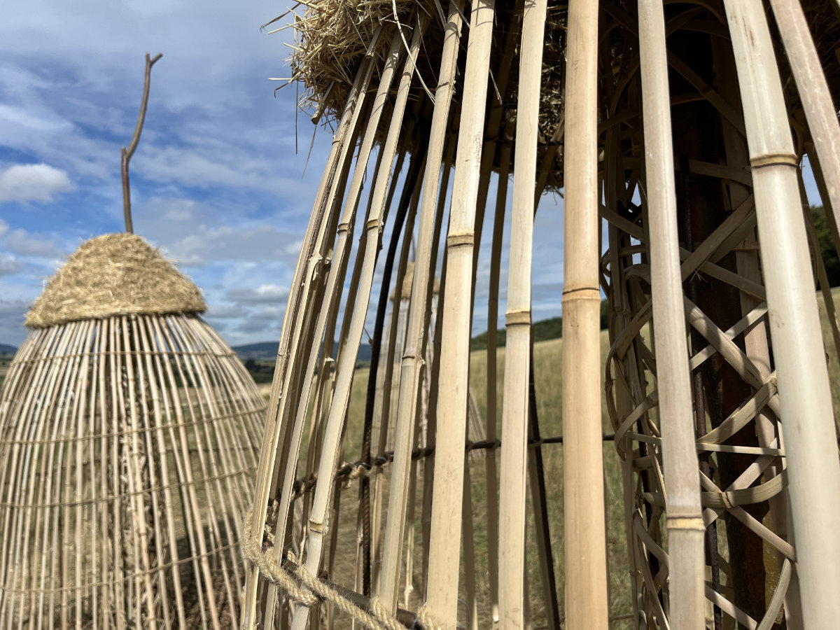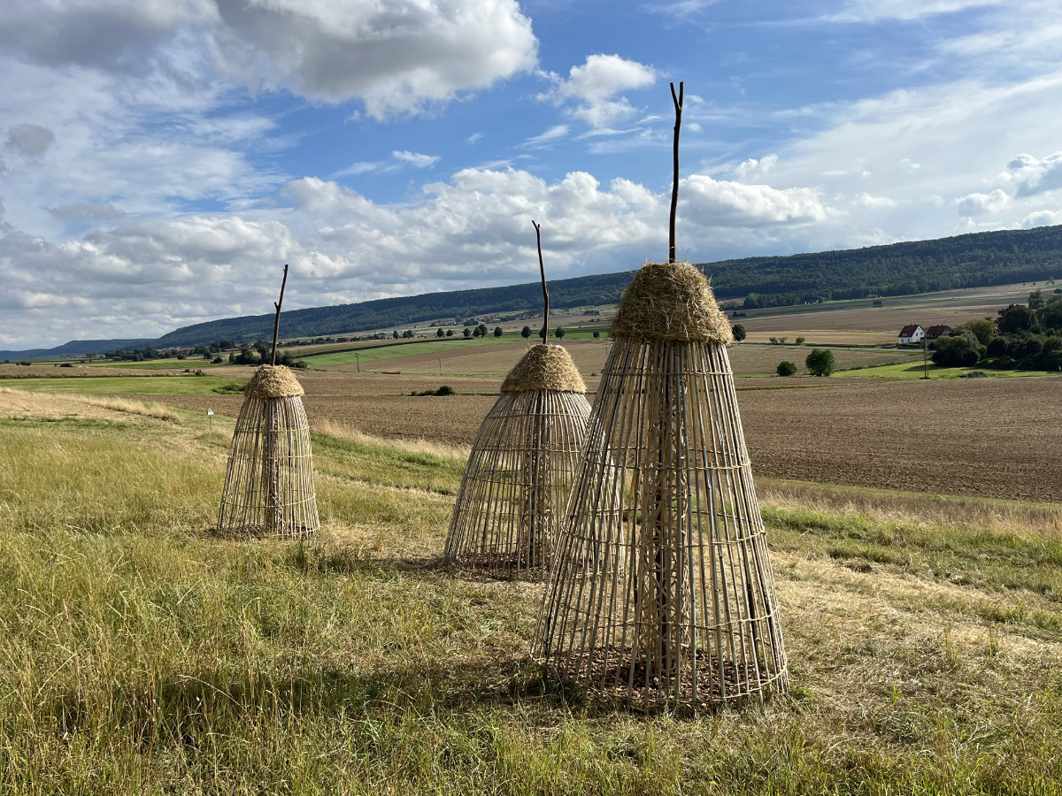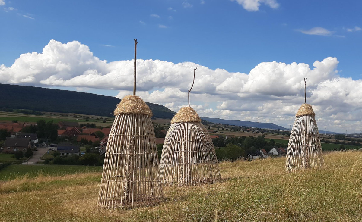Three transparent figures rise from the ground, like a mirage. Their shape loosely refers to the old fashioned haystacks, but now you can see straight through. In their middle is a woven tube that goes into or comes out of the ground. A big branch protrudes from the top, like an antenna. It is the connection between above and below, out of the ground and into the ground. As haystacks have vanished by now from the European landscape, the sculptures are a poetic reminder of the small scale agriculture and the way we used to be connected to the earth for so long.